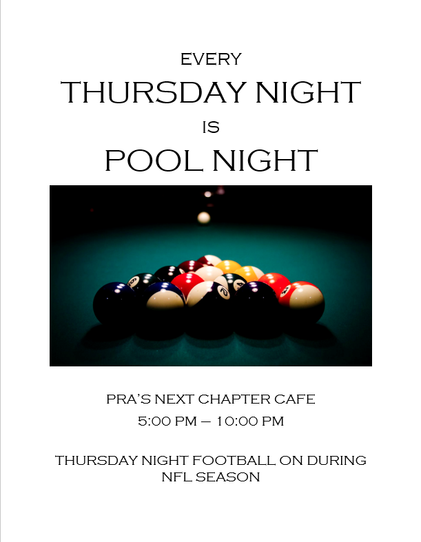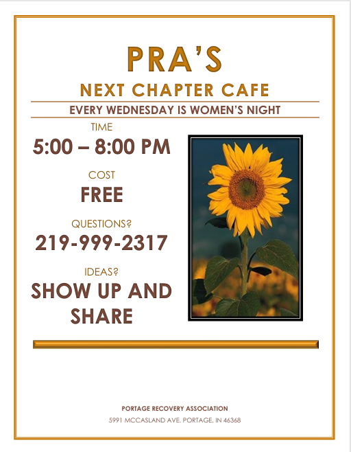 PRA’s Next Chapter Cafe is the first of its kind Sober Sports Bar / Recovery Cafe hybrid hangout for members of the recovering community, their family and friends, and the City of Portage and surrounding areas. We, as recovering members, will strive to promote a safe environment for all who join us. The only requirement for entry is 24 hours of complete abstinence from drugs and alcohol.